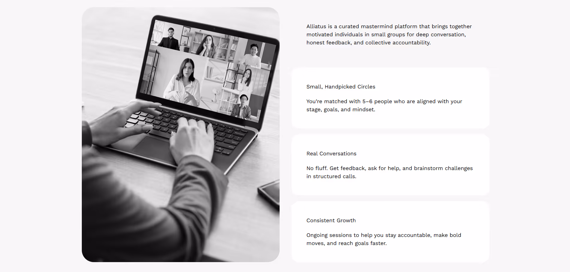 Alliatus is a curated mastermind platform that connects ambitious people into small, handpicked circles for real conversations, honest feedback, and consistent accountability—so you can grow faster and move with clarity.